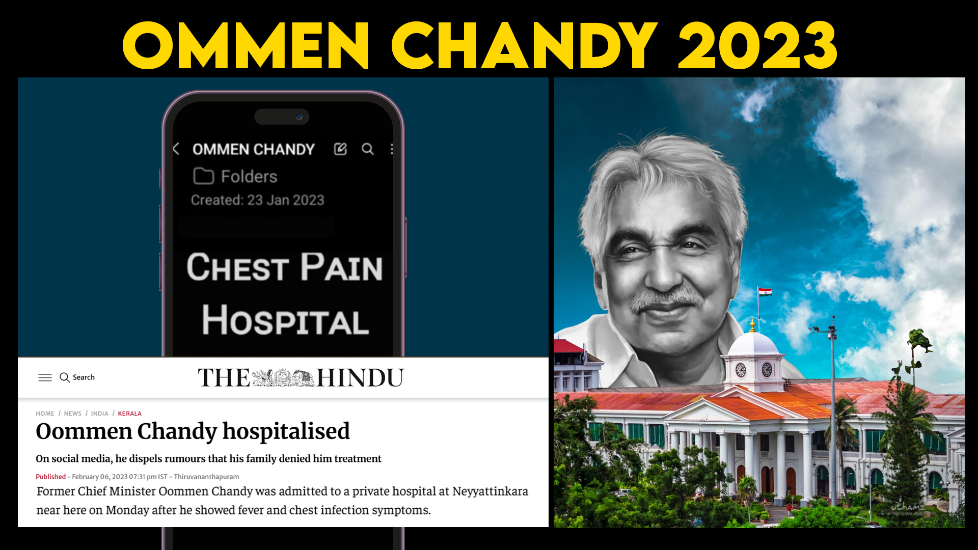 - NEWS: Former Chief Minister Oommen Chandy was admitted to a private hospital at Neyyattinkara after he showed fever and chest infection symptoms. Despite the treatments, on various issues, Chandy succumbed to the disease and died on 18 July 2023 at the age of 79 due to complications from throat cancer.